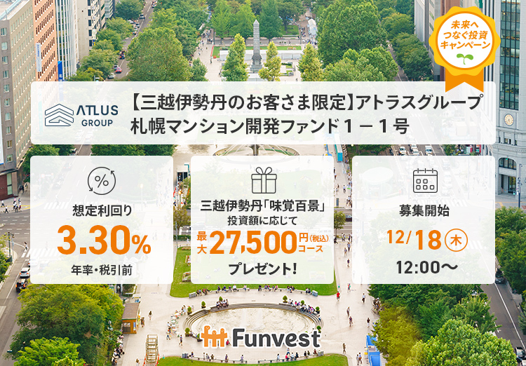 ※本ファンドの投資対象は、『アトラスグループ 札幌マンション開発プロジェクト1-1号』の投資対象である貸付契約と同一のため、ファンドの償還日も同じです。詳しくは「関係者情報」をご確認ください。(要ログイン)