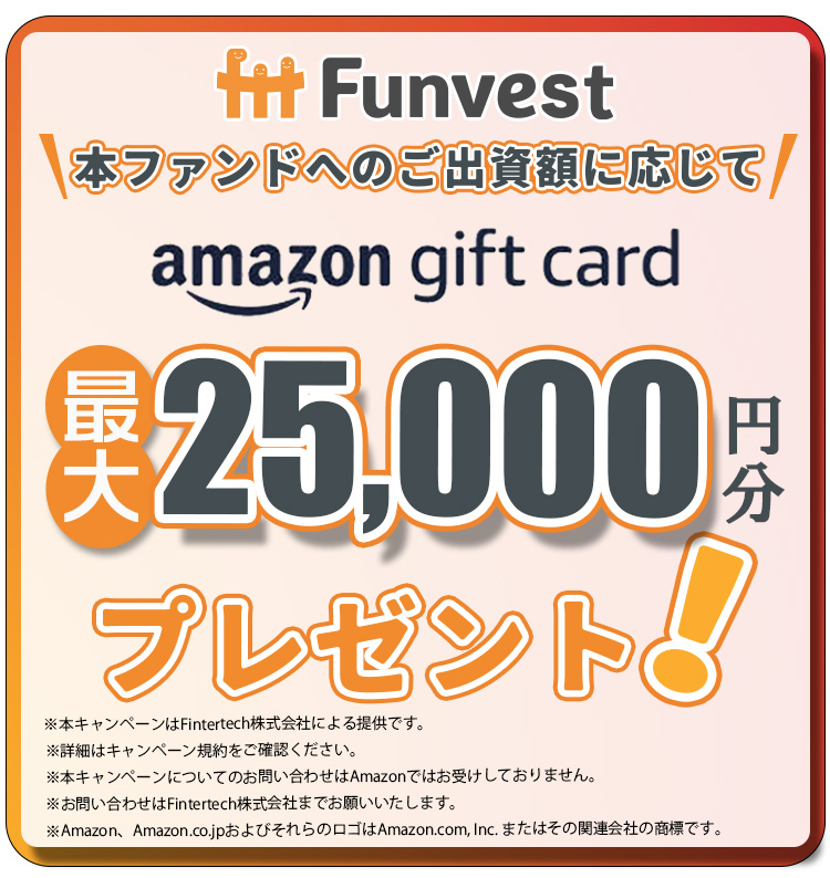 ※「出資」とは、匿名組合契約約款に基づく匿名組合契約を指し、元本が保証されているものではありません。借入人や営業者の財務状況、信用状況の悪化に伴い、元本の一部もしくは全部が毀損する可能性がございますので、契約締結前書面ほか関連書類をご確認いただき、お客様自身のご判断と責任において投資を行っていただきますようお願い致します。