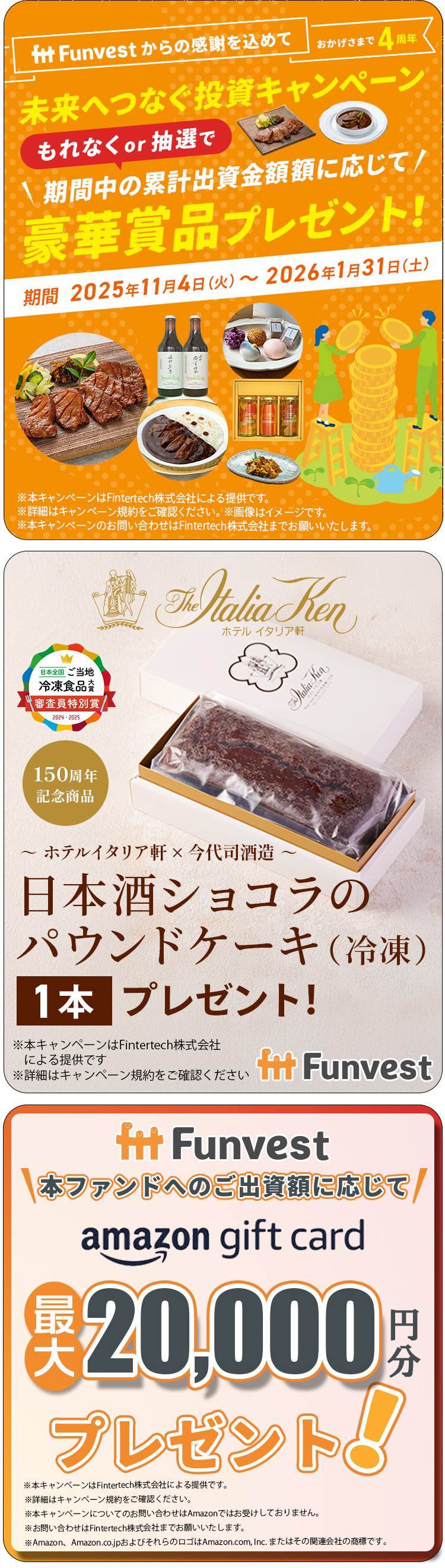 ※「出資」とは、匿名組合契約約款に基づく匿名組合契約を指し、元本が保証されているものではありません。借入人や営業者の財務状況、信用状況の悪化に伴い、元本の一部もしくは全部が毀損する可能性がございますので、契約締結前書面ほか関連書類をご確認いただき、お客様自身のご判断と責任において投資を行っていただきますようお願い致します。