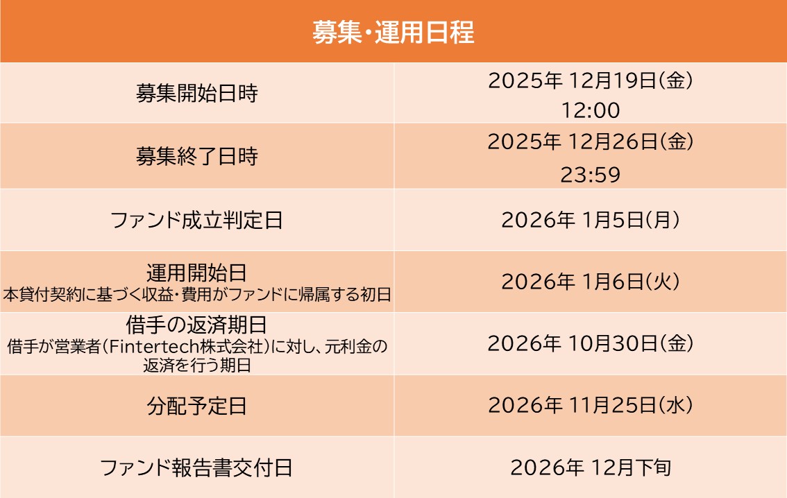 本ファンドは、ファンドの成立に先立ち、Fintertech株式会社(営業者)が自己の資金にて貸付けを行う「先行貸付」スキームを採用しております。