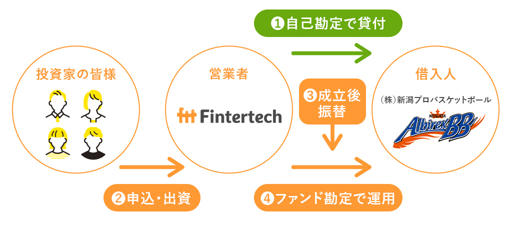 Fintertech株式会社(以下「営業者」といいます)は、株式会社新潟プロバスケットボールに対し、円建てで貸付けを行い、同社は事業により得られた収益から、元利金の支払いを行います。