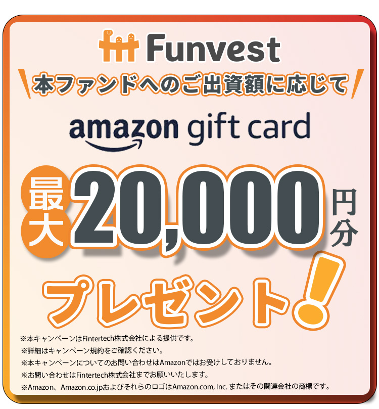 ※「出資」とは、匿名組合契約約款に基づく匿名組合契約を指し、元本が保証されているものではありません。借入人や営業者の財務状況、信用状況の悪化に伴い、元本の一部もしくは全部が毀損する可能性がございますので、契約締結前書面ほか関連書類をご確認いただき、お客様自身のご判断と責任において投資を行っていただきますようお願い致します。