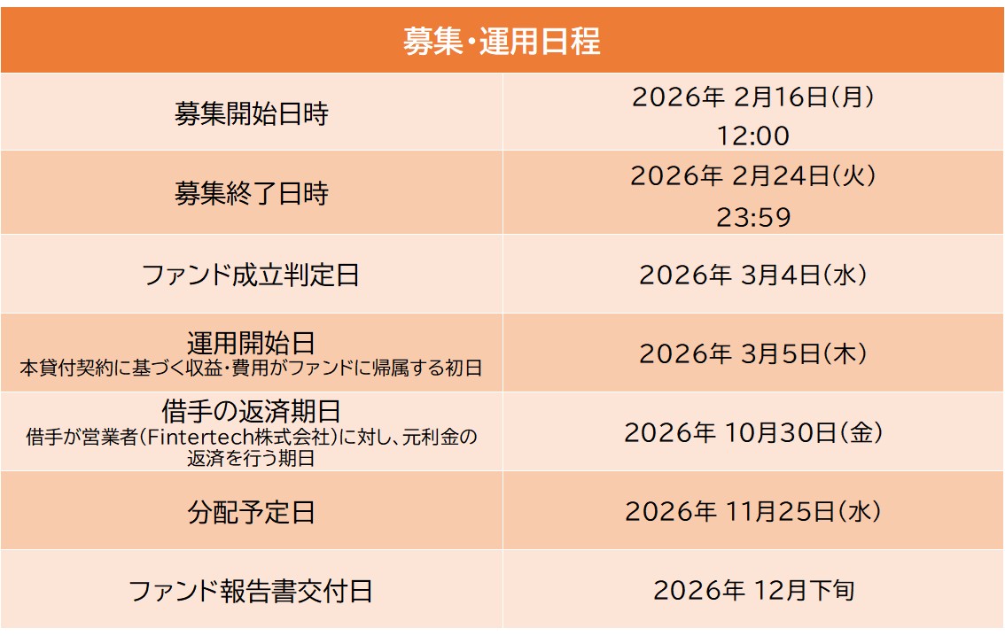 本ファンドは、ファンドの成立に先立ち、Fintertech株式会社(営業者)が自己の資金にて貸付けを行う「先行貸付」スキームを採用しております。
