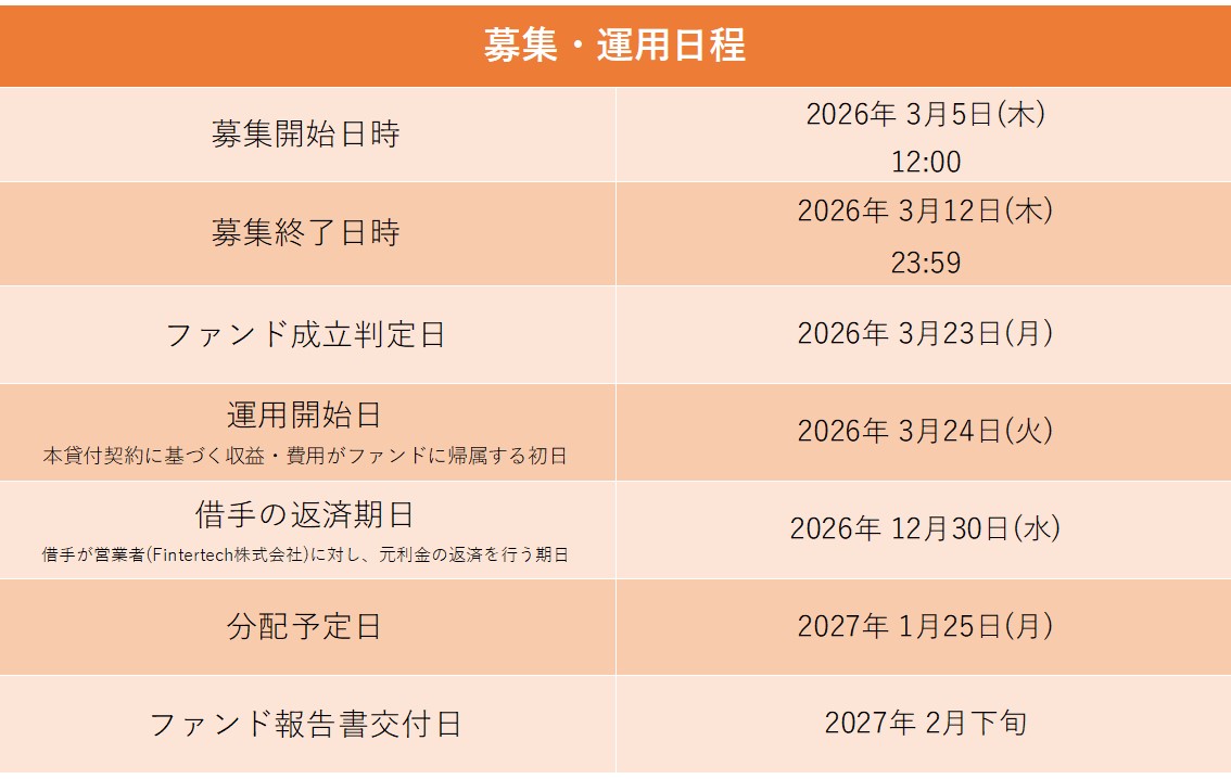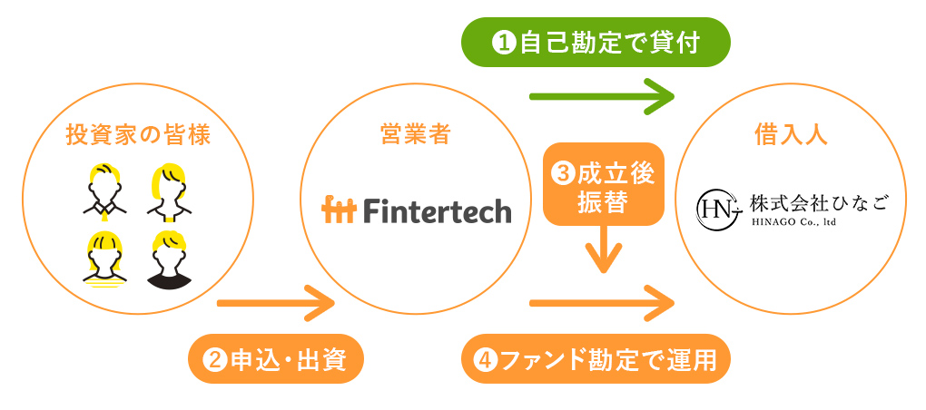 Fintertech株式会社(以下「営業者」といいます)は、株式会社ひなごに対し、円建てで貸付けを行い、同社は事業により得られた収益から、元利金の支払いを行います。