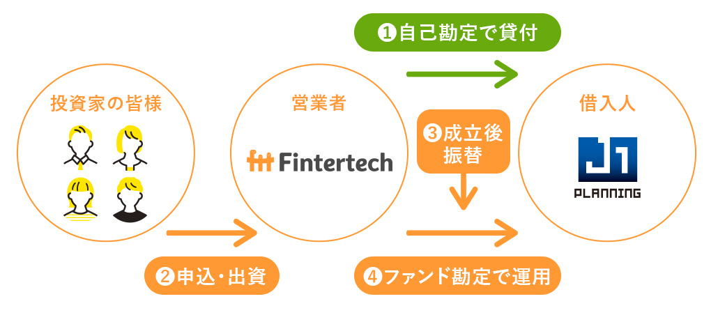 本ファンドは、ファンドの成立に先立ち、Fintertech株式会社(営業者)が自己の資金にて貸付けを行う「先行貸付」スキームを採用しております。