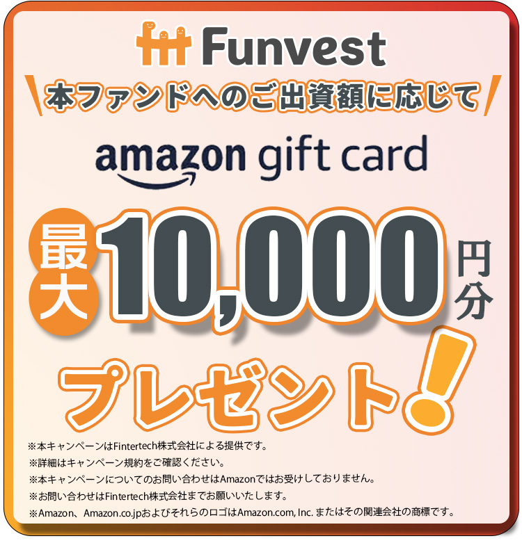 ※「出資」とは、匿名組合契約約款に基づく匿名組合契約を指し、元本が保証されているものではありません。借入人や営業者の財務状況、信用状況の悪化に伴い、元本の一部もしくは全部が毀損する可能性がございますので、契約締結前書面ほか関連書類をご確認いただき、お客様自身のご判断と責任において投資を行っていただきますようお願い致します。