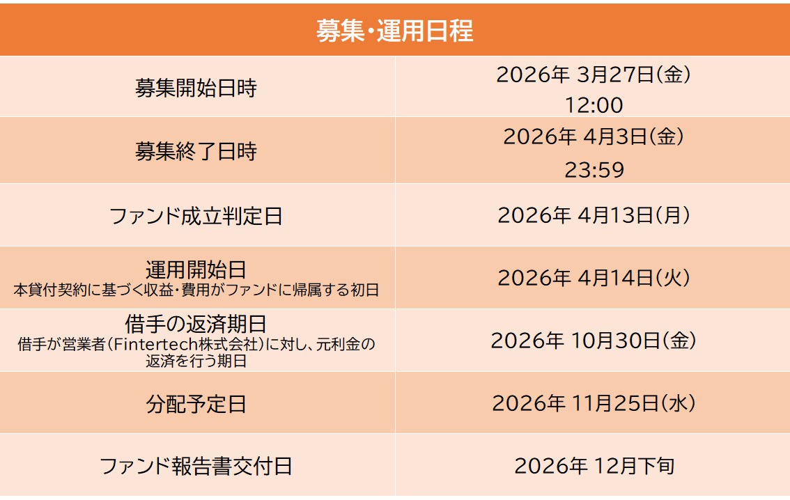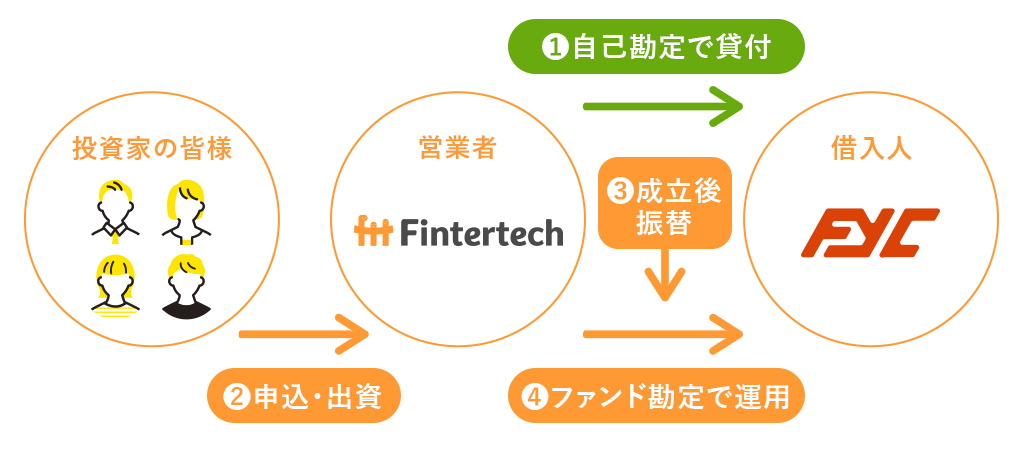 Fintertech株式会社(以下「営業者」といいます)は、株式会社FYCに対し、円建てで貸付けを行い、同社は事業により得られた収益から、元利金の支払いを行います。