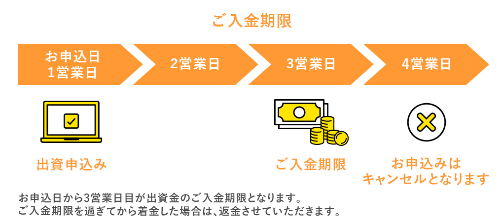 出資金の入金期限は、お申込日(匿名組合契約締結日)を含む3営業日目の日となります。(※具体的なご入金期限は、申込完了後にお送りするメールをご確認ください。)