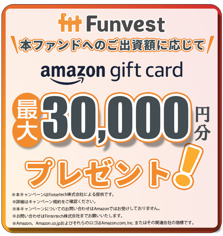 ※「出資」とは、匿名組合契約約款に基づく匿名組合契約を指し、元本が保証されているものではありません。借入人や営業者の財務状況、信用状況の悪化に伴い、元本の一部もしくは全部が毀損する可能性がございますので、契約締結前書面ほか関連書類をご確認いただき、お客様自身のご判断と責任において投資を行っていただきますようお願い致します。