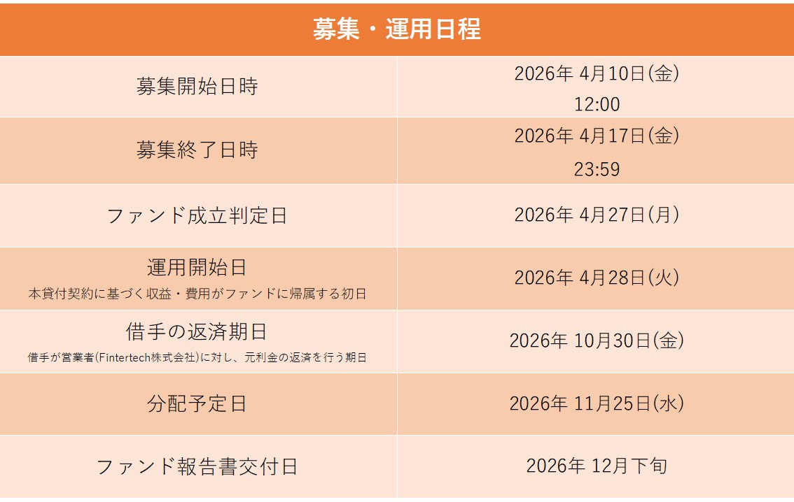 本ファンドは、ファンドの成立に先立ち、Fintertech株式会社(営業者)が自己の資金にて貸付けを行う「先行貸付」スキームを採用しております。