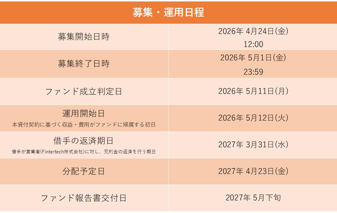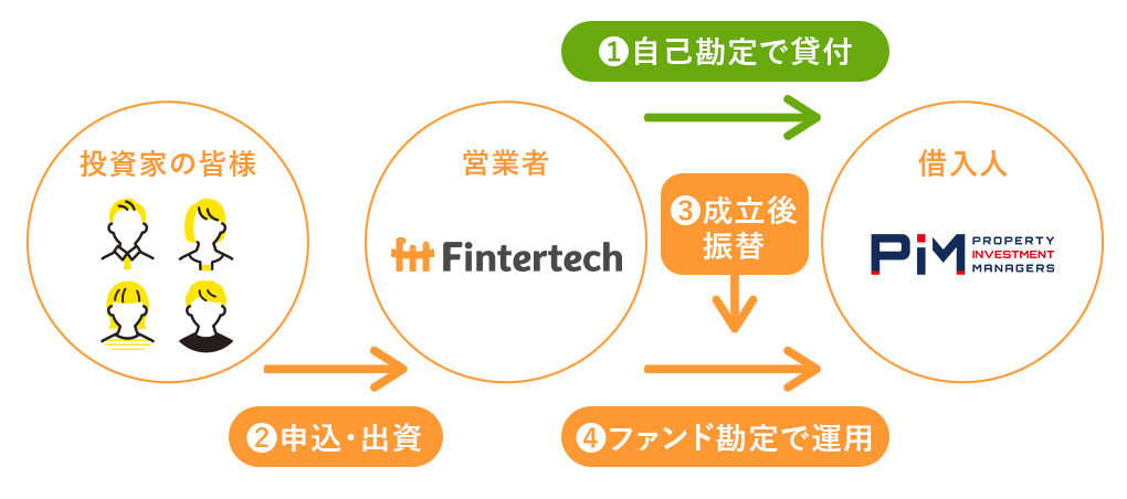 Fintertech株式会社(以下「営業者」といいます)は、株式会社PIMに対し、円建てで貸付けを行い、同社は事業により得られた収益から、元利金の支払いを行います。