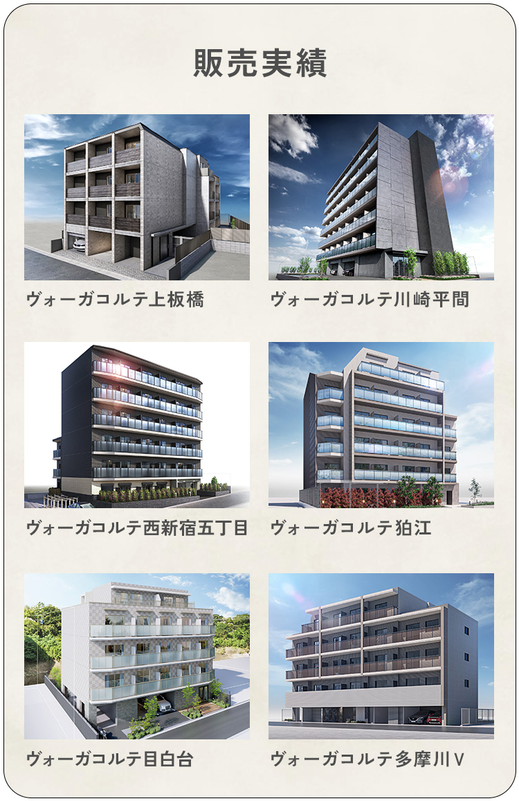 右記の販売実績(上板橋、川崎平間、西新宿五丁目、狛江、目白台、多摩川Vなど)に象徴されるように、主要ターミナルへのダイレクトアクセスが可能な好立地を厳選して展開。単に住居を提供するだけでなく、機能美を追求した設備、時代に左右されない外観デザインを採用することで、入居者には「住む誇り」を、オーナー様には「持つ喜び」を提供しています。