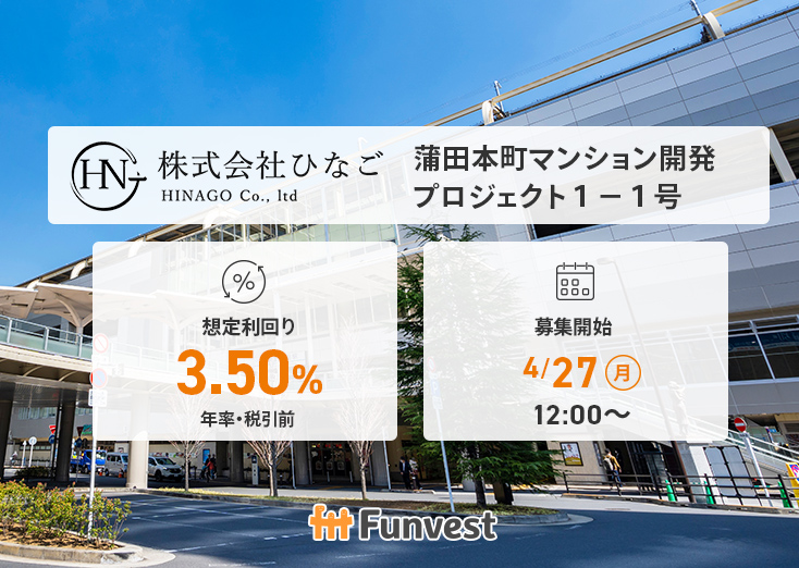 株式会社ひなごは、不動産業・建設業を営む日本の企業(非上場)です。Fintertech株式会社(営業者)は、クラウドファンディングにより出資頂いた資金を同社に対し貸付けることで運用を行います。