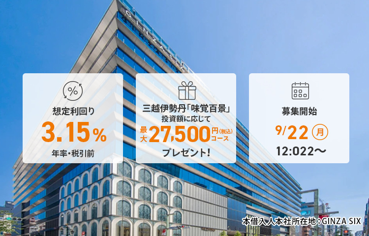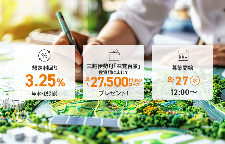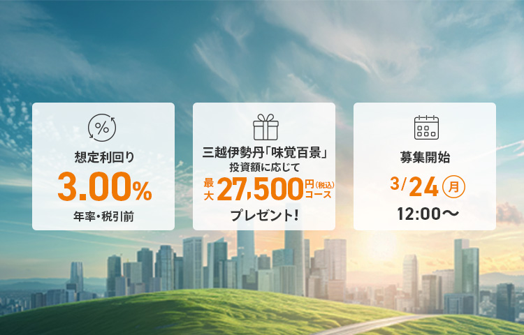 本借入人に対する貸付債権の財産的価値、営業者の信用状況等により損失が発生するおそれがあります。ファンドの交付書面、募集ページの内容を十分にご理解いただき、お客様ご自身の判断と責任にて投資を行っていただきますようお願い申し上げます。