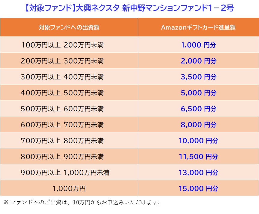 新ファンド「大興ネクスタ 新中野マンションファンド1-2号」の募集に合わせて、Amazonギフトカードプレゼントキャンペーンを実施いたします。