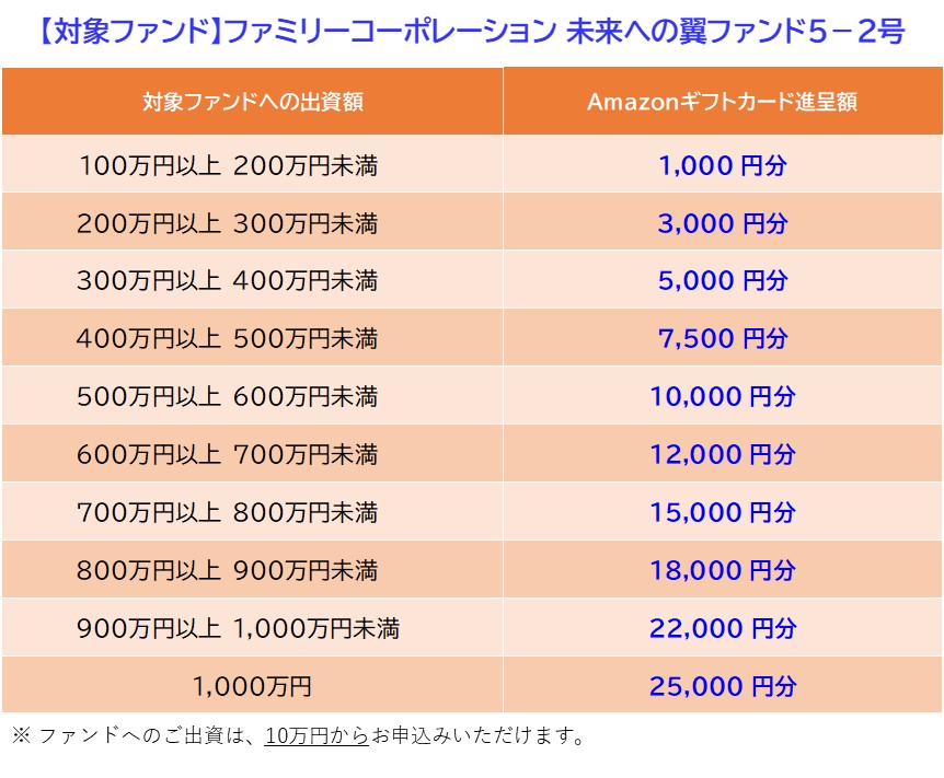 新ファンド「ファミリーコーポレーション 未来への翼ファンド5-2号」の募集に合わせて、Amazonギフトカードプレゼントキャンペーンを実施いたします。
