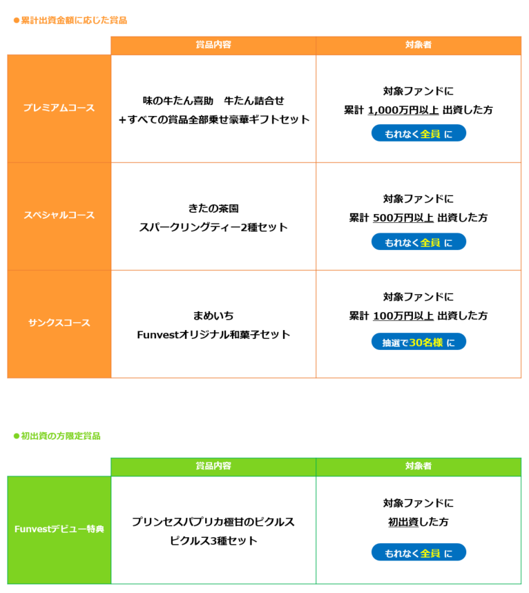 ・キャンペーン期間中に初出資した方は、累計出資金額に応じた賞品に加え、Funvestデビュー特典を進呈いたします。