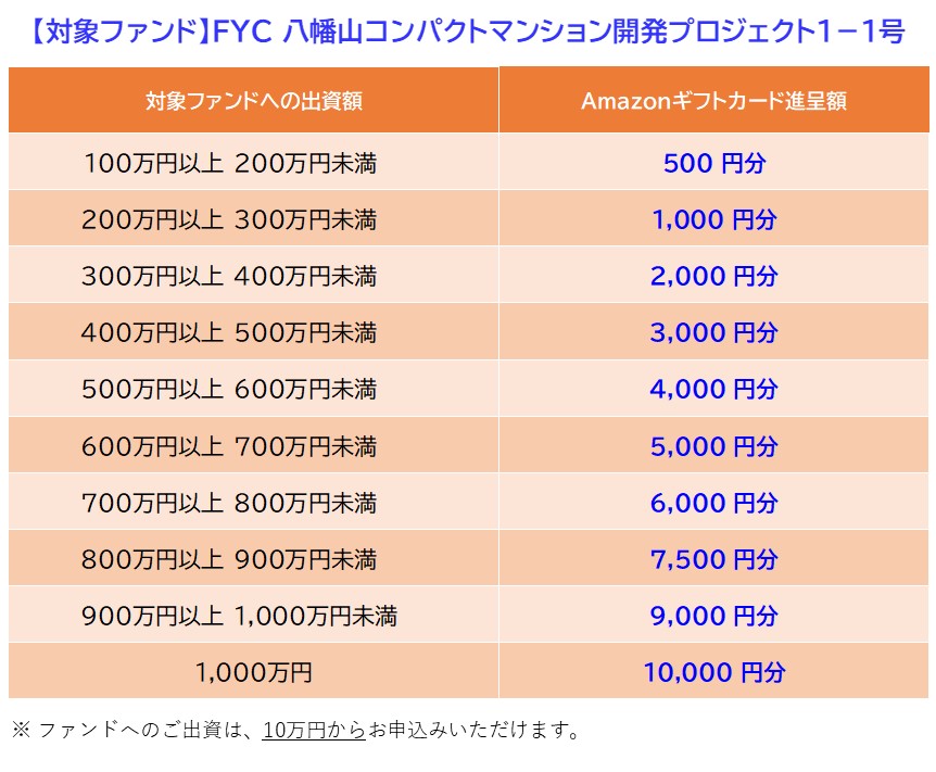 新ファンド「FYC 八幡山コンパクトマンション開発プロジェクト1-1号」の募集に合わせて、Amazonギフトカードプレゼントキャンペーンを実施いたします。