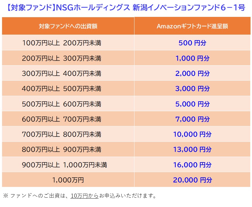 新ファンド「NSGホールディングス 新潟イノベーションファンド6-1号」の募集に合わせて、Amazonギフトカードプレゼントキャンペーンを実施いたします。