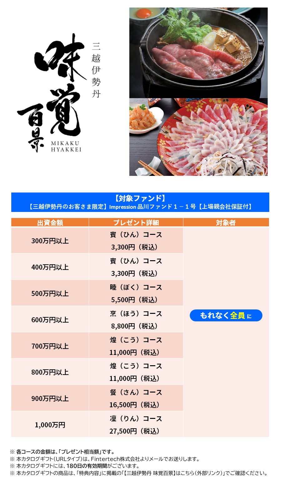 対象ファンドへのご出資金額に応じて「三越伊勢丹 味覚百景」カタログギフトをプレゼント!・特典の送付時期