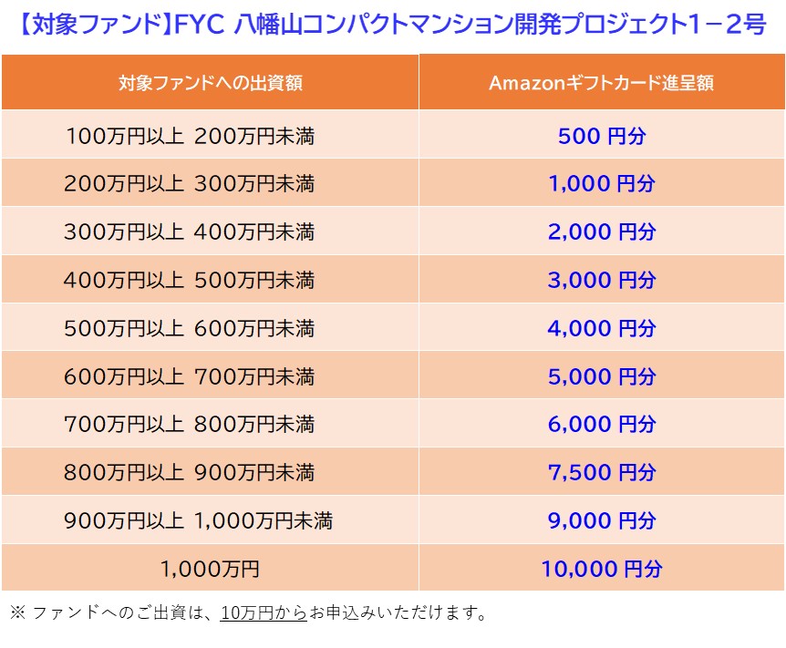 新ファンド「FYC 八幡山コンパクトマンション開発プロジェクト1-2号」の募集に合わせて、Amazonギフトカードプレゼントキャンペーンを実施いたします。