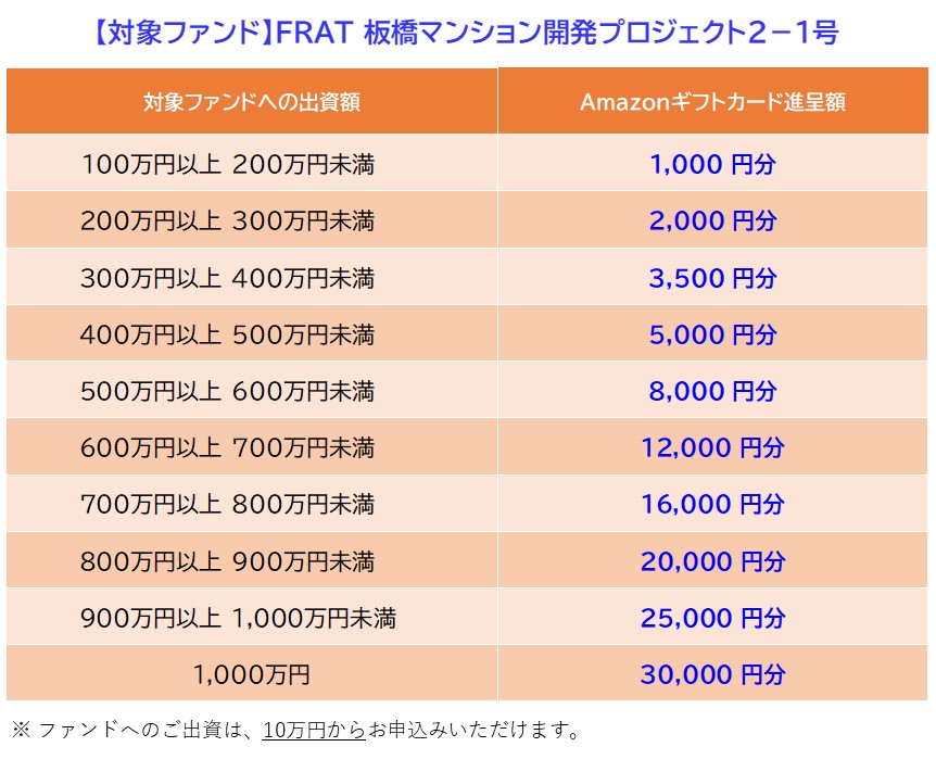 新ファンド「FRAT 板橋マンション開発プロジェクト2-1号」の募集に合わせて、Amazonギフトカードプレゼントキャンペーンを実施いたします。