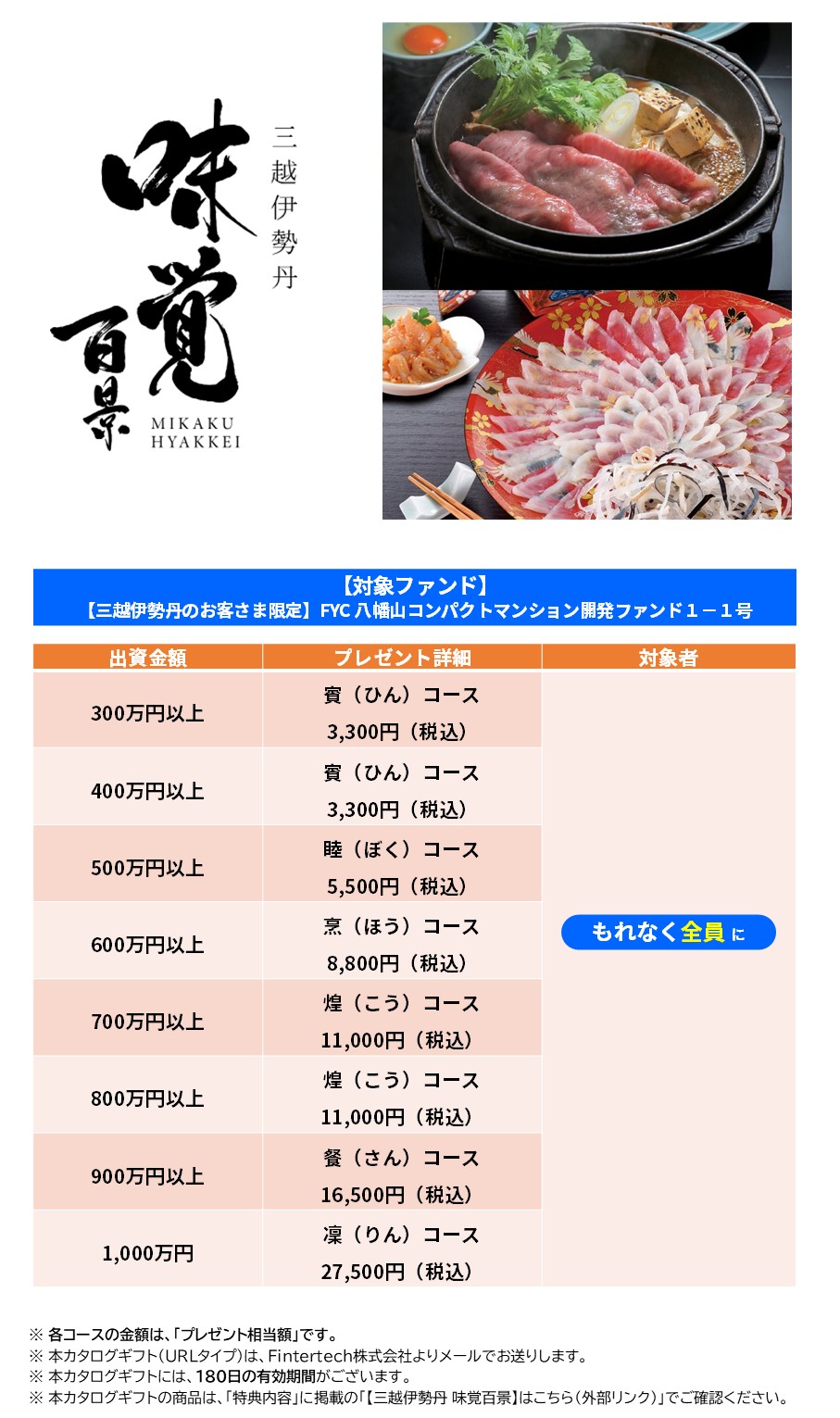 新ファンド「【三越伊勢丹のお客さま限定】FYC 八幡山コンパクトマンション開発ファンド1-1号」の募集に合わせて、「三越伊勢丹 味覚百景」カタログギフトプレゼントキャンペーンを実施いたします。