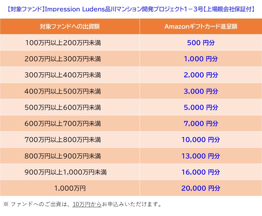 新ファンド「Impression Ludens品川マンション開発プロジェクト1-3号【上場親会社保証付】」の募集に合わせて、Amazonギフトカードプレゼントキャンペーンを実施いたします。