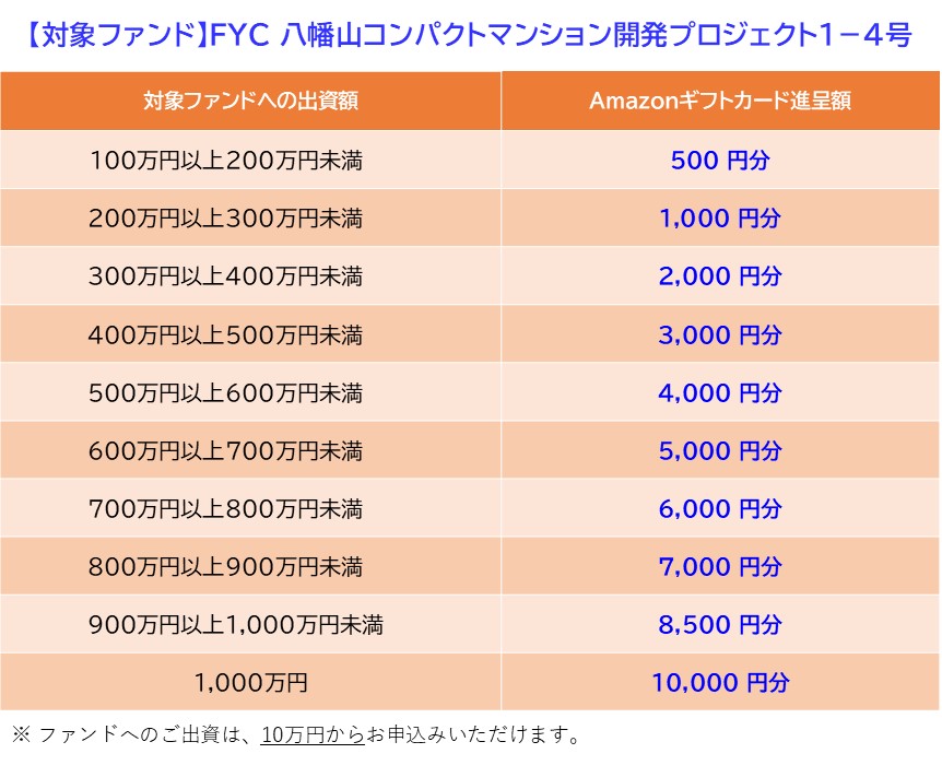 新ファンド「FYC 八幡山コンパクトマンション開発プロジェクト1-4号」の募集に合わせて、Amazonギフトカードプレゼントキャンペーンを実施いたします。