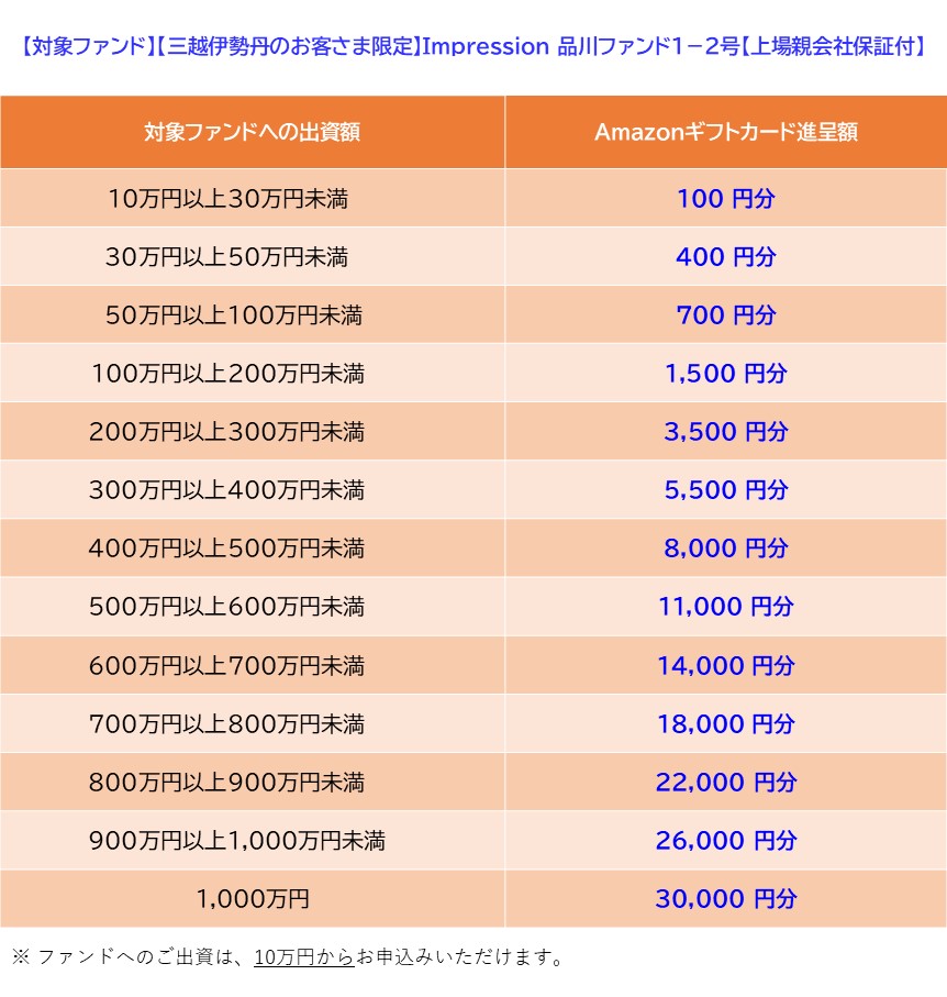 新ファンド「【三越伊勢丹のお客さま限定】Impression 品川ファンド1-2号【上場親会社保証付】」の募集に合わせて、Amazonギフトカードプレゼントキャンペーンを実施いたします。