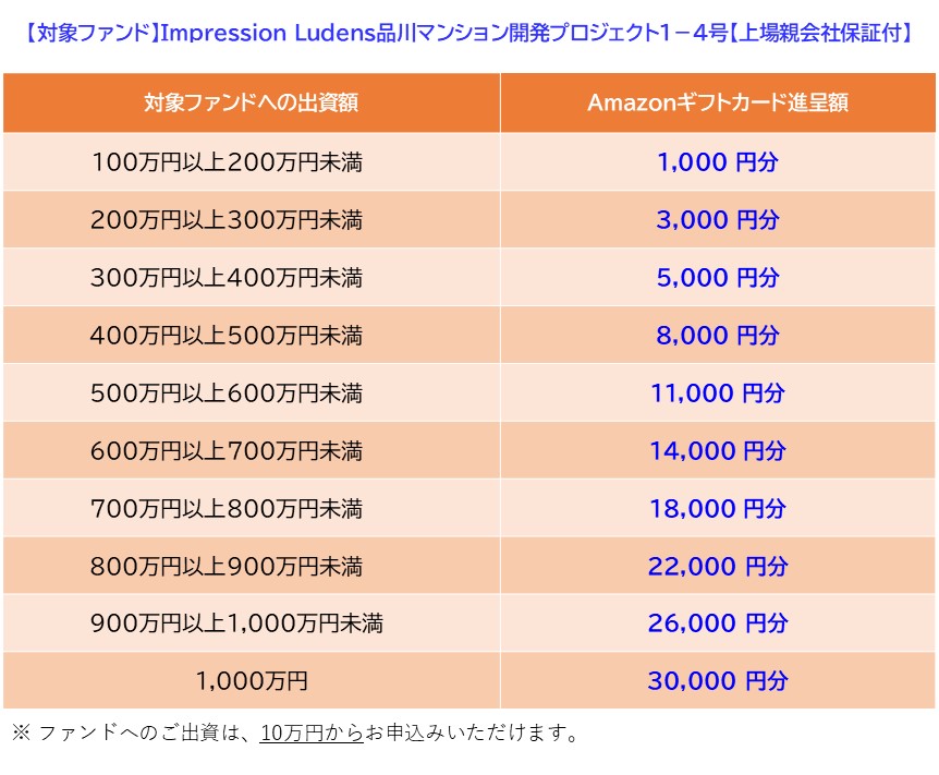 新ファンド「Impression Ludens品川マンション開発プロジェクト1-4号【上場親会社保証付】」の募集に合わせて、Amazonギフトカードプレゼントキャンペーンを実施いたします。